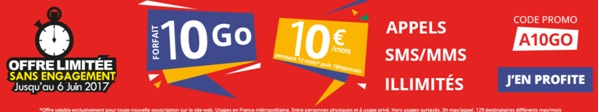 L’opérateur Auchan Telecom commercialise depuis quelques jours une offre spéciale avec un forfait sans engagement 10Go facturé 10€ par mois pendant 12 mois au lieu de 16.99€. Cette offre promotionnelle est valable jusqu’au 6 juin prochain. Pour en bénéficier, il vous suffit d’indiquer lors de votre souscription en ligne le code réduction A10GO. Pour information, cette offre est valable exclusivement pour toute nouvelle souscription sur le site web.