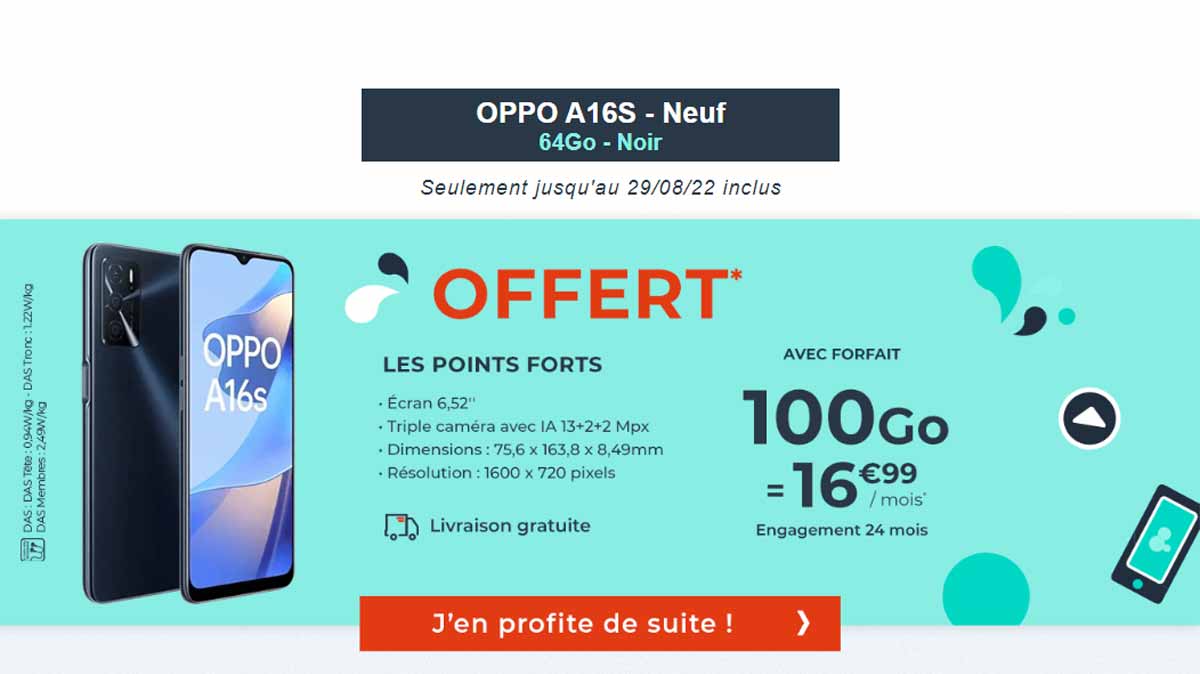 Un Oppo A16S Neuf offert avec un forfait 100 Go à 16,99€ par mois, ça vous tente ?