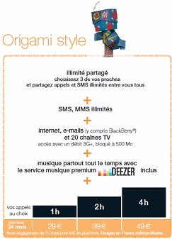 Origami star : Une gamme de 5 forfaits mobiles de 1H à 6H à partir de 39€ qui cible ceux qui veulent envoyer des SMS en illimité, appeler en illimité (le soir et / ou le week-end) et surfer sur Internet. Les offres comprennent illimité partagé, l'internet, les e-mails avec pièces jointes (y compris BlackBerry et Nokia Messaging) et 20 chaînes TV illimités, débit 3G+, réduit au-delà de 2 Go (au lieu de 1 Go actuellement), les appels illimités vers tous les opérateurs le soir et/ou le week-end en fonction du forfait choisi et enfin les SMS et MMS illimités 24h/7j en France métropolitaine. Disponibles sur 12 mois pour 6€ de plus par mois.