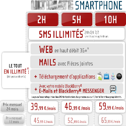 Le forfait 2h00 Ultimate Smartphone à 39,99€/mois pour engagement de 24 mois et 45,99€/mois pour un engagement de 12 mois, le forfait Ultimate Smartphone 5h00 à 46,99€/mois pour un engagement de 24 mois et 52,99€ pour un engagement de 12 mois, le forfait Ultimate Smartphone 10h00 à 59,99€/mois pour un engagement de 24 mois et 65,99€ pour un engagement de 12 mois. Ce sont des forfaits tout en illimité SMS, WEB, Mails, téléchargement d'applications Blackberry, OVI, Android. E-mails et BlackBerry Messenger en illimité également avec votre mobile BlackBerry. Vous bénéficiez du web en haut débit 3G+ (restriction de 1Go) et des e-mails avec pièces jointes.