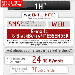 Forfait bloqué d’1h00 de communication incluant SMS, WEB, E-Mails et BlackBerry Messenger en illimité (débit ajusté au delà de 200Mo) est à 24,90€/mois sur un engagement de 24 mois et à 28,90€/mois sur un engagement de 12 mois.