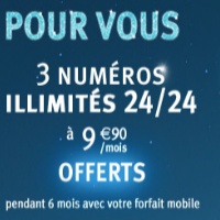 Bouygues Telecom offre pendant 6 mois à tous les nouveaux abonnés l'option 3 numéros illimités vers tous les opérateurs. Pour profiter de la remise, vous devez souscrire à cette option entre le 15/11/10 et le 16/01/11, elle sera ensuite facturée 9.90€ et à partir du 17/01/2010, l'option baisse de prix et passe à 5€ automatiquement.