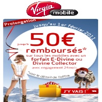 Jusqu’à 50€ remboursés valable sur tous les mobiles Virgin Mobile pour tout achat d’un pack Virgin Mobile et souscription concomitante à un forfait E-Divine 1H ou 2H avec engagement 24 mois ou à un forfait Divine Collector 2H avec engagement 24 mois et jusqu’à 100€ remboursés valable sur tous les mobiles Virgin Mobile pour tout achat d’un pack Virgin Mobile et souscription concomitante à un forfait E-Divine 4H avec engagement 24 mois ou à un forfait Divine Collector 4H avec engagement 24 mois.