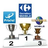 Carrefour Mobile obtient la première place du podium avec une moyenne de 14.86 sur 20. Rappelons que Carrefour Mobile propose de nombreux forfaits avec ou sans engagement à partir de 8.90€ par mois. Prixtel se place en deuxième position avec une moyenne de 14.67 sur 20 et sur la dernière marche du podium on retrouve Universal Mobile qui se classe avec une moyenne de 14.45 sur 20. Notons que l'opérateur Virgin Mobile arrive en quatrième position et pourrait bientôt détrôner Universal Mobile. En effet, Virgin Mobile obtient une note de 13.47 sur 20.