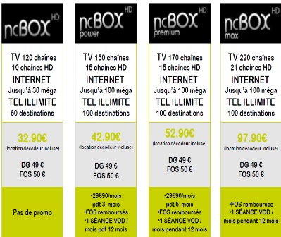 Vous profiterez également de promotions valables sur certaines offres de Numéricable dès le 01 février 2011. L'offre NCBox HD Power sera facturé 29.90€ pendant 3 mois au lieu de 42.90€, et pour l'offre NCBox HD Premium, vous bénéficiez du tarif de 29.90€ pendant 6 mois au lieu de 52.90€. Les frais d'accès au service de 50€ sont remboursés avec toutes les offres NCBox ainsi qu'une séance VOD offerte par mois pendant 12 mois (hors NCBox HD).