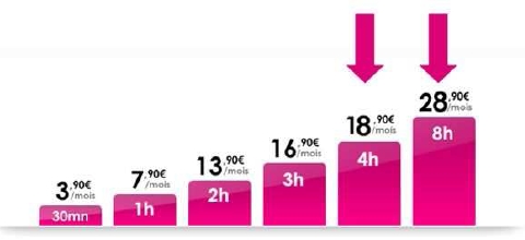 Afin de répondre au mieux à la demande, Talktel Mobile a décidé de baisser à nouveau ses tarifs. En effet à partir du 1er février l'offre 4heures à 19,50€ passera à 18,90€ et l'offre 8heures passera de 29,50€ à 28,90€. Voici les offres en détail :