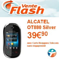 Dès aujourd'hui et jusqu'au 27 février minuit, Bouygues Télécom met en avant un pack prépayé à 39,90€ au lieu de 59€, comprenant le téléphone mobile Alcatel OT880 et une carte sim prépayée.