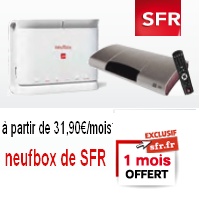 SFR lance une opération exceptionnelle pour toute souscription à une offre Neufbox ou NeufBox Evolution entre le 01 et le 31 Mars 2011. En effet, vous profitez d'un mois d'abonnement gratuit pour toute nouvelle inscription à une Neufbox en indiquant lors de l'enregistrement le code Promo 1MOIS.