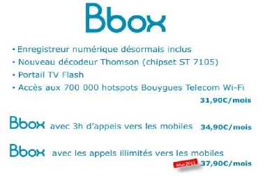 Bouygues Telecom confirme les nouveaux tarifs Bbox. L’enregistreur numérique est bien inclus de base, et la Bbox se transforme en HotSpot WiFi, au choix des clients. Par défaut, ceux-ci seront toutefois activés, en se rendant sur l’espace client il sera possible de le désactiver. Des informations supplémentaires sont données, comme une option 1h par jour pour 1 € de plus sur les mobiles, mais surtout les appels illimités vers les mobiles seront proposés en mai.