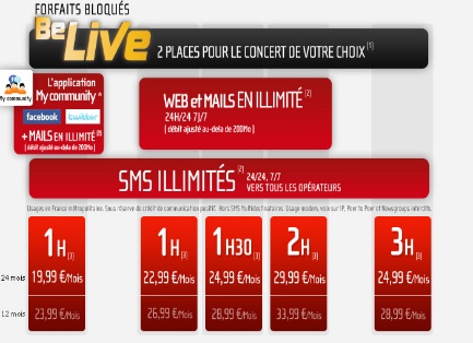 Concernant les forfaits bloqués, NRJMobile propose 2 nouveaux forfaits bloqués BeLive avec sms illimités et 2 places de concert offertes. Avec les forfaits 1h, 1h30 et 2h bloqués, vous profitez en plus des sms, de l'accès à Internet et Mails limité à 200Mo par mois.