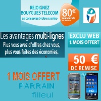 Vous profitez toujours du mois offert pour toute souscription en ligne à un forfait mobile Neo.4, Smartphone, Evasio2, iPhone, classics, et ideo ... de Bouygues Telecom (hors forfaits bloqués) jusqu'au 22 mai 2011 ainsi que les forfaits en Version Eco (offre sans mobile).
