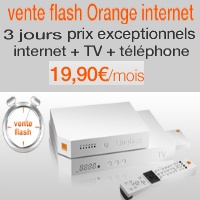Orange propose une vente flash dès ce soir minuit pendant 3 jours sur une sélection d’offres Internet+TV+Tél. En effet pour toute souscription à une offre NET (Internet, TV et téléphone illimité sans abonnement téléphonique) entre le 24 et 26 mars 2011, vous profitez d'une remise exceptionnelle pendant 6 mois sur le prix mensuel. L'offre Net sera alors facturée 19.90€ pendant 6 mois puis 37€ (hors location de la livebox à 3€ par mois).