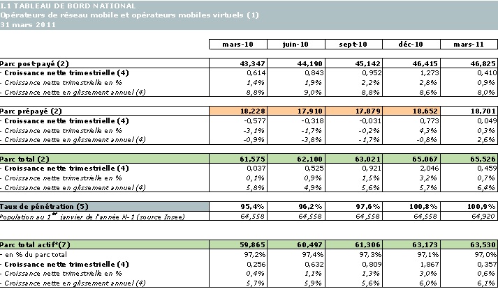 L'ARCEP (Autorité de régulation des communications électroniques et des postes) a publié hier un rapport provisoire des chiffres du marché de la téléphonie mobile en France sur le 1er trimestre 2011.