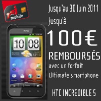 NRJMobile qui utilise le réseau de l'opérateur Orange propose un remboursement différé de 100€ sur l'achat du HTC Incredible S associé à un forfait Ultimate Smartphone. Le mobile vous revient à 1€ grâce au remboursement avec ces forfaits (soit 101€ - 100€). Pour profiter du remboursement de 100€ sur ce mobile, vous devez donc souscrire à un forfait Ultimate Smartphone proposé à partir de 39,99€ avec un engagement de 24 mois. Voici le détail de ces abonnements :