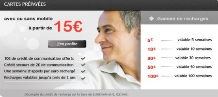 Le décompte du crédit de recharge s'effectue sur la base de 0.50€/min et 0.12€/sms.