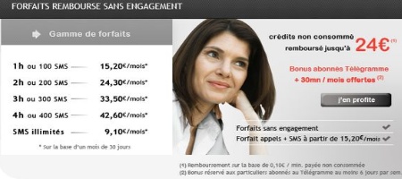 Le Télégramme Mobile s’engage à vous rembourser chaque mois les minutes de communications que vous n’auriez pas consommées sur le base de 0.10€/min dans votre forfait sous forme d’avoir sur la facture suivante. Le forfait est sans engagement, vous pouvez donc résilier sans frais votre abonnement à tout moment.