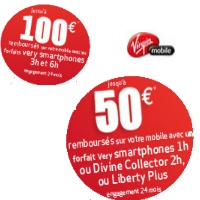 Plus que quelques jours pour profiter jusqu’à 50€ ou 100€ remboursés valable sur tous les mobiles Virgin Mobile pour tout achat d’un pack Virgin Mobile et la souscription concomitante à un forfait Very Smartphones ou à un forfait Liberty Plus avec engagement 24 mois. Cette offre est valable jusqu'au 22/06/2011. Le montant du remboursement ne pourra excéder le prix de vente total du mobile acheté en souscrivant à un forfait.