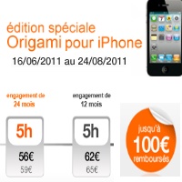 Le forfait Edition Spéciale Origami pour iPhone comprend 5 heures d'appels vers tous les opérateurs ainsi que les SMS et MMS en illimité 24h/24 et 7j/7. Vous profitez également d'un accès Internet, emails, 60 chaînes TV, et la navigation GPS avec Orange Maps en illimité avec un volume de 2Go par mois au delà réduction débit jusqu'à la prochaine date de facturation. Vous bénéficiez en plus d'une connexion illimitée aux hotspots Orange WiFi, de la messagerie vocale visuelle, et d'Orange Messenger.