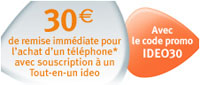 L’opérateur Bouygues Telecom propose depuis quelques jours 30€ de remise immédiate pour l’achat d’un téléphone avec la souscription à une offre Tout -en-un-ideo avec un engagement de 12 mois minimum. Pour en bénéficier, il vous suffit de rentrer le code promo IDEO30 lors de votre commande. Le prix du téléphone doit être supérieur à 31€.
