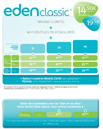 Eden classic, appels, SMS, l’essentiel au meilleur prix : de 1 à 4h d’appels + SMS/MMS illimités à partir de 14,90€ par mois. Les forfaits existent en version ECO (sans mobile) et version IDEO pour les 2H et 4H (offre quadruleplay internet + TV + fixe + mobile)
