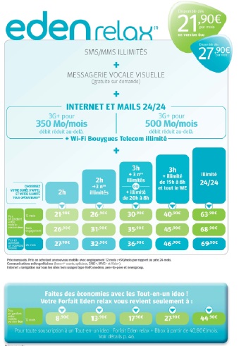 Eden relax, pour rester connecté : Des forfaits allant de 2h d’appels à appels illimités 24h/24 + SMS/MMS illimités + hotspots Wi-Fi Bouygues Telecom, messagerie vocale visuelle, Internet et mails 24/24 (enveloppe de 350 ou 500 Mo par mois, réduction du débit au-delà) à partir de 21,90€ par mois. Les forfaits existent en version ECO (sans mobile) et version IDEO pour les 2H et 4H (offre quadruleplay internet + TV + fixe + mobile)