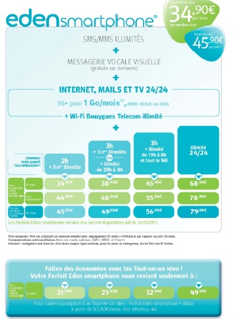 Eden smartphone, pour profiter de son smartphone à 100% : de 2h d’appels + 3 numéros illimités à appels illimités 24h/24 + SMS/MMS illimités, hotspots Wi-Fi Bouygues Telecom, messagerie vocale visuelle, Internet, mails, modem et TV 24/24 (3G+ jusqu’à 1Go par mois) à partir de 34,90€ par mois.