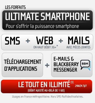 Le temps de communication démarre à 2H et peut aller jusqu'à 10H par mois à un prix à partir de 39.99€. Le Web, emails avec pièces jointes (Limité à un volume de 1GO par mois au delà réduction de débit jusqu'à la prochaine date de facturation) et les SMS sont illimités 24h/24 et 7j/7 vers tous les opérateurs. Cette offre est également compatible avec un Blackberry.. Le réseau utilisé pour ce forfait est celui de l'opérateur SFR.