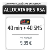 L’opérateur NRJ Mobile propose désormais un forfait bloqué réservé aux allocataires du RSA. Il s’agit d’un forfait bloqué sans engagement avec 40 minutes de communication par mois et 40 SMS. Ce forfait mobile intègre la présentation du numéro, le double appel, le report des minutes ainsi qu’une alerte conso (envoi d’un SMS pour maitriser votre consommation). Le forfait bloqué RSA est facturé tous les mois 9.99€. Par contre, vous ne pouvez pas acquérir un mobile avec cette offre.