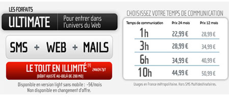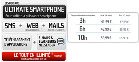 Si vous êtes accro au net, cet opérateur mobile propose aussi les forfaits Ultimate Smartphone de 3 heures à 10 heures de communication par mois à partir de 41.99€ par mois. Ces derniers intègrent un accès Internet en illimité jusqu’à 1Go par mois au-delà le débit est ajusté jusqu’à la prochaine date de facturation. Les forfaits Ultimate Smartphone sont compatibles avec un téléphone Blackberry (Blackberry Messenger). Tout comme les forfaits Ultimate, les SMS sont illimités vers tous les opérateurs 24h/24 et 7j/7, vous disposez également du double appel, de la présentation de numéro ainsi que le report des minutes.