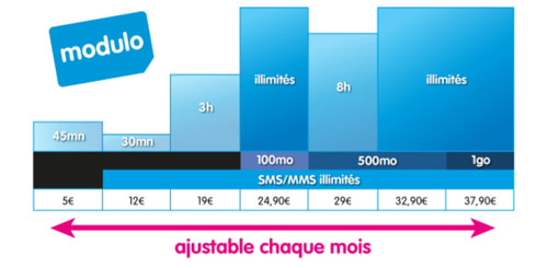 Avec Modulo 2, plus besoin de choisir et plus de changer d’offre car ce forfait s’ajuste chaque mois à votre consommation : voix, SMS et Internet. Celui-ci est facturé au minimum tous les mois 5€ pour 45 minutes de communication à 37.90€ maximum par mois pour un forfait avec les appels illimités 24h/24 et 7j/7 vers tous les opérateurs (appels vers les téléphones fixes et mobiles en France métropolitaine vers 199 correspondants / 2 h maximum par appel), les SMS/MMS illimités ainsi qu’un accès Internet dans la limite de 1Go par mois. Cette offre Modulo 2 est sans engagement de durée.
