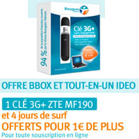 C’est Noël chez Bouygues Telecom ! En effet, ce fournisseur Internet vous offre en ce moment une clé 3G + ZTE MF190 ainsi que 4 jours de surf pour 1€ de plus. Cette offre promotionnelle est valable pour toute souscription en ligne à une offre Bbox ou Tout-en-Un Ideo. Cette promo est disponible jusqu’au 1 janvier 2012, ne perdez pas de temps ! Pour en profiter, il vous suffit de renvoyer un coupon avec les éléments demandés. Cette clé vous sera alors renvoyée sous 8 jours.