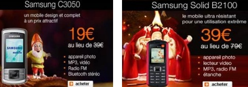 Si vous souhaitez en profiter pour vous équiper d’un nouveau mobile, Orange vous propose également deux mobiles en vente flash le : Samsung C3050 à 19€ au lieu de 39€ et le Samsung B2100 Solid à 39€ au lieu de 79€.