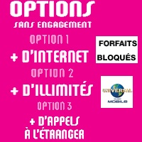 L'opérateur Universal Mobile qui commercialise uniquement des forfaits bloqués proposent depuis peu des nouvelles options sans engagement. En effet, vous pouvez ajouter à votre forfait bloqué une option pour un accès Internet ou encore des appels illimités vers 3 numéros tous opérateurs et des options Voyage pour vos appels depuis l'étranger. Ces options sont souscriptibles depuis votre Espace Client et vous pourrez décider de déduire le prix de ces options de votre crédit ou de les acheter en supplément. Voici le détail et tarif de ces nouvelles options :