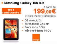 Vous désirez une tablette Samsung Galaxy Tab 8.9 pour Noël ! Orange propose en ce moment une offre de remboursement de 100€ valable pour toute souscription à un forfait Let’s Go 1Go pour tablette et l’achat d’une tablette tactile 3G+ d’une valeur minimale de 101€. Pour profiter de ce remboursement, il vous suffit de renvoyer le coupon-réponse avec les documents demandés à Orange. Cette offre promotionnelle Orange est valable jusqu’au 8 février 2012.