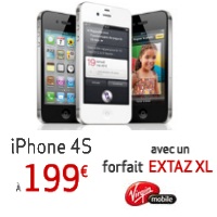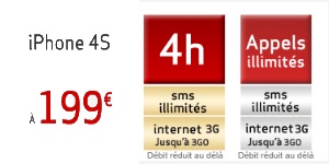 L’iPhone 4S 16GO est également à 199€ avec le forfait Extaz XL illimité à 57.99€ avec un engagement de 24mois qui intègre les appels illimités vers tous les fixes et mobiles en France (199 numéros différents par mois) ainsi que les sms illimités et Internet et emails avec un volume data de 3Go par mois au delà une réduction de débit est appliquée.
