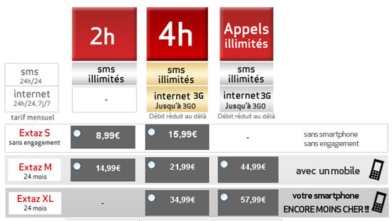 Si vous ne souhaitez pas vous engager, il faut opter pour un forfait Extaz S. Cette gamme Extaz S comprend deux forfaits sans mobile et sans engagement. Plus précisément, celle-ci intègre un forfait Extaz 2H à seulement 8.99€ par mois avec les SMS illimités et un forfait Extaz 4H avec les SMS illimités et Internet 3Go (débit réduit au-delà) à 15.99€ par mois.