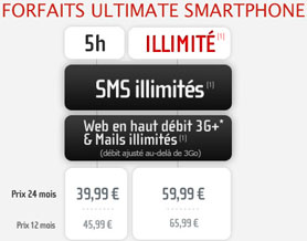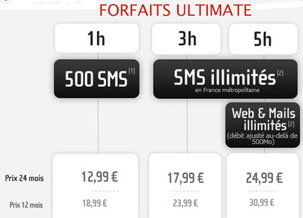 La gamme Ultimate Smartphone intègre de 2 paliers horaires, 5 heures et appels illimités avec les SMS illimités et 3 Go de volume data, au-delà le débit est réduit. De plus, avec ces forfaits Ultimate Smartphone, vous pouvez bénéficier jusqu’au 31 mars prochain d’un remboursement jusqu’à 150€ sur le prix de votre mobile pour toute souscription à un forfait Ultimate Smartphone avec un engagement de 24 mois. Voici plus de détails :