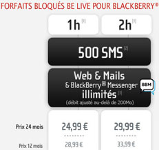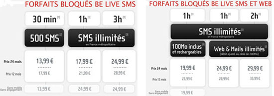 Les forfaits bloqués de NRJ Mobile évoluent également ! Ces derniers se déclinent en trois gammes : les forfaits BeLive SMS, les forfaits BeLive SMS et Web qui intègrent un accès Internet et les forfaits BeLive Blackberry qui se composent d'un accès Web, mails et BlackBerry Messenger en illimité. Désormais, avec ces nouveaux forfaits bloqués, vous pouvez bénéficier de l’avantage -18 ans, pour accompagner votre adolescent dans son 1er équipement mobile, celui-ci bénéficie de 30 minutes d’appels tous les mois pour vous appeler quand son crédit est épuisé. De plus, vous pouvez également profiter de 2 places offertes pour le concert de votre choix. Voici plus de détails :