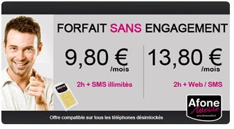 AfoneMobile décline une offre SANS ENGAGEMENT avec 2 heures et SMS illimités pour 9,80 €/TTC/mois.