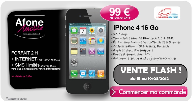 AfoneMobile met en avant du 15 au 19 Mars prochain l’iPhone 4 16Go. Ce téléphone portable est proposé en vente flash à 99€ au lieu de 229€ avec la souscription simultanée à un forfait 2h à partir de 28.99€ avec un engagement de 24 mois.