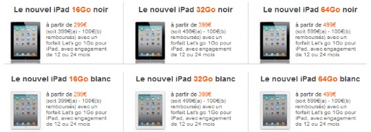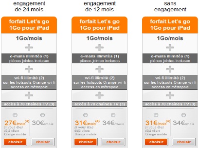 Orange rembourse jusqu’à 100€ pour l’achat d’un iPad avec la souscription simultanée à un forfait Let’s Go 1Go avec un engagement de 12 mois minimum jusqu’au 04 avril prochain. Pour toute souscription en ligne à ce forfait avec un engagement de 24 mois, vous bénéficiez de 2 mois offerts du 09 février au 04 avril 2012.
