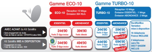 NordNet vient d’apporter des changements à ses offres Internet et propose désormais un nouveau forfait Internet par satellite à sa gamme Turbo. La nouvelle formule comprend un accès Internet jusqu’à 10Méga avec un trafic illimité jusqu’au 28 Février 2014 pour toute souscription avant le 31 Mai 2012 puis 26Go de trafic inclus. La connexion en illimité était jusque là disponible uniquement avec les forfaits Internet de la gamme ECO-10.