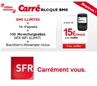 Les gammes Carré Web et Carré iPhone se limitent désormais à une édition spéciale illimitée à partir de 37€ par mois sur engagement de 24 mois (sans mobile). Ces offres comprennent les appels illimités 24h/24 vers tous les opérateurs fixes et mobiles en France métropolitaine + les SMS et MMS illimités 24h/24 et 7j/7, Internet, Mails 1Go rechargeable + Accès Wifi illimité aux hotspsots SFR