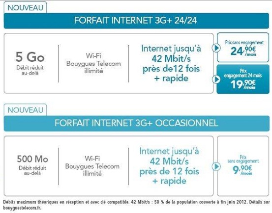 A partir du 18 juin, vous trouverez tout d’abord un forfait Internet 3G+ 24/24 à 19,90€/mois avec un engagement de 24 mois ou à 24,90€/mois sans engagement.