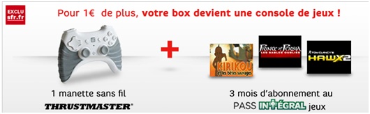 Bon plan du moment : Pour les 2000 premiers abonnements à la BOX de SFR du 04/07/2012 au 31/07/2012, profitez d'1 manette de jeux sans fil Thrustmaster et de 3 mois d'abonnement premium 'Jeux à la demande' offerts pour toute souscription à une offre éligible à la TV.
