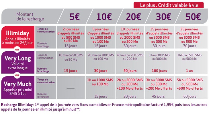 * Crédit de navigation sur Internet offert à partir de l’achat d’une recharge de 20€ sur le plan tarifaire Very Much valable depuis la France métropolitaine (hors services payants) et sous réserve d’un mobile compatible, variable selon le montant de la recharge. Une fois le crédit offert épuisé, facturation au tarif 0.01€/100ko. Usages modem, voix sur IP, peer to peer, newsgroups, envois de spams interdits et décomptés du crédit au tarif en vigueur. Suivi conso disponible en envoyant *131# ou en appelant le 848 depuis votre mobile.
