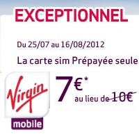 L’opérateur virtuel Virgin Mobile propose des forfaits mobiles, mais aussi des cartes prépayées et des abonnements quadrupleplay. Jusqu’au 16 août prochain, Virgin Mobile met en place une promotion pour tout achat d’une carte Sim prépayée : elle est à 7€ au lieu de 10€.