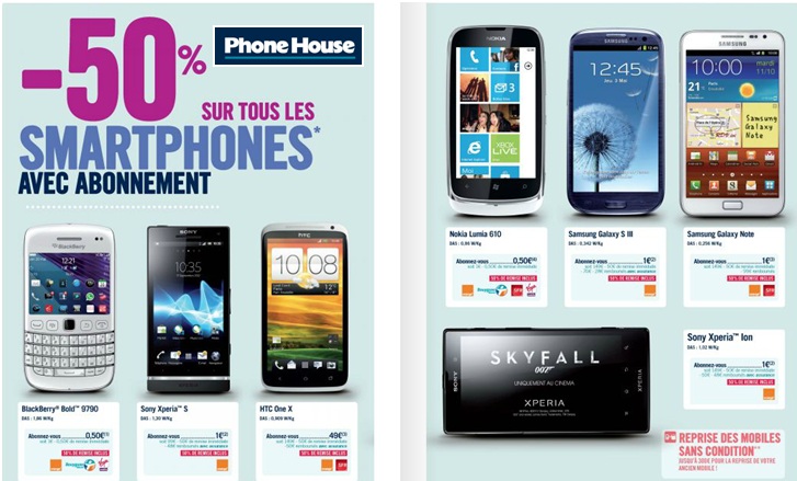 1er bon plan : Les clients peuvent profiter de Smartphones à moitié prix et de tablettes offertes avec abonnement. Cette offre est accessible à tout client achetant un mobile et souscrivant simultanément à un forfait 2h et plus chez Orange, Bouygues Telecom, SFR ou à un forfait 4h XL ou plus chez Virgin Mobile (sur un engagement de 24 mois minimum). La gamme de Smartphones concernée se compose de nouveaux modèles comme les Sony Xperia Ion et BlackBerry Bold 9790 mais aussi des immanquables iPhone 4S, Samsung Galaxy S III, Samsung Galaxy Note, HTC One X, Nokia Lumia 610. Le Samsung Galaxy SIII, le Samsung Galaxy Note et le Sony Xperia Ion sont par exemple proposés à partir de 1 € avec la souscription simultanée à un forfait mobile Orange.