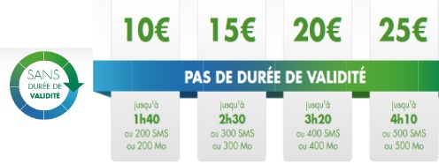 La carte Sim est au tarif de 4.99€ avec 15 min de communication inclus et les frais de livraison sont offerts. Vous profitez de 6 montants de recharges allant de 10 à 60€ avec des prix les plus bas : 0.10€ par minute pour les appels, 0.05€ pour les sms et 0.05€ par Mo pour l’accès Internet. Vous n’avez aucun risque de perdre votre crédit, aucune contrainte d’utilisation. Il vous suffit d’émettre une communication payante par an pour que votre ligne reste active.