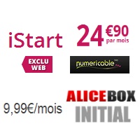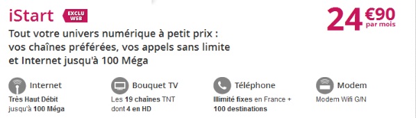 L’offre iStart de Numericable est proposé au tarif de 24.90€ et intègre un accès internet jusqu’à 100 Méga, un accès aux 19 chaines TNT dont 4 en HD ainsi que le téléphone illimité vers les fixes en France et vers 100 destinations étrangères. Cet abonnement est disponible uniquement sur Internet et pour l’accès TV vous devez disposer d’un équipement compatible TNT.